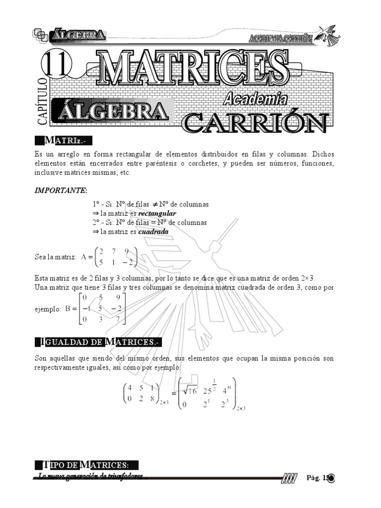 Una matriz que tiene 3 filas y tres columnas se denomina matriz cuadrada de orden 3, como por