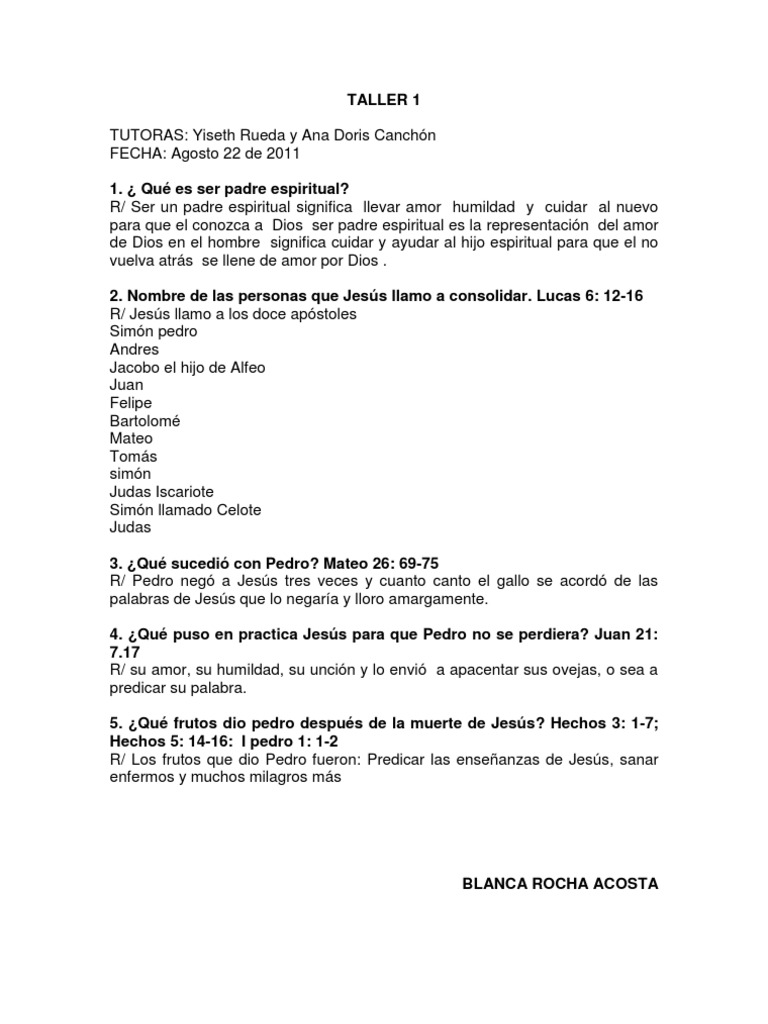 ? R/ Ser un padre espiritual significa llevar amor humildad y cuidar al nuevo para que el conozca a Dios ser padre espiritual es la representacin del amor de Dios en el hombre significa cuidar y ayudar al hijo espiritual para que el no vuelva atrs se llene de amor por Dios . 2. Nombre de las personas que Jess llamo a consolidar. Lucas 6: 12-16 R/ Jess llamo a los doce apstoles Simn pedro Andres Jacobo el hijo de Alfeo Juan Felipe Bartolom Mateo Toms simn Judas Iscariote Simn llamado Celote Judas 3. Qu sucedi con Pedro? Mateo 26: 69-75 R/ Pedro neg a Jess tres veces y cuanto canto el gallo se acord de las palabras de Jess que lo negara y lloro amargamente. 4. Qu puso en practica Jess para que Pedro no se perdiera? Juan 21: 7.17 R/ su amor, su humildad, su uncin y lo envi a apacentar sus ovejas, o sea a predicar su palabra. 5. Qu frutos dio pedro despus de la muerte de Jess? Hechos 3: 1-7; Hechos 5: 14-16: I pedro 1: 1-2 R/ Los frutos que dio Pedro fueron: Predicar las enseanzas de Jess, sanar enfermos y muchos milagros ms