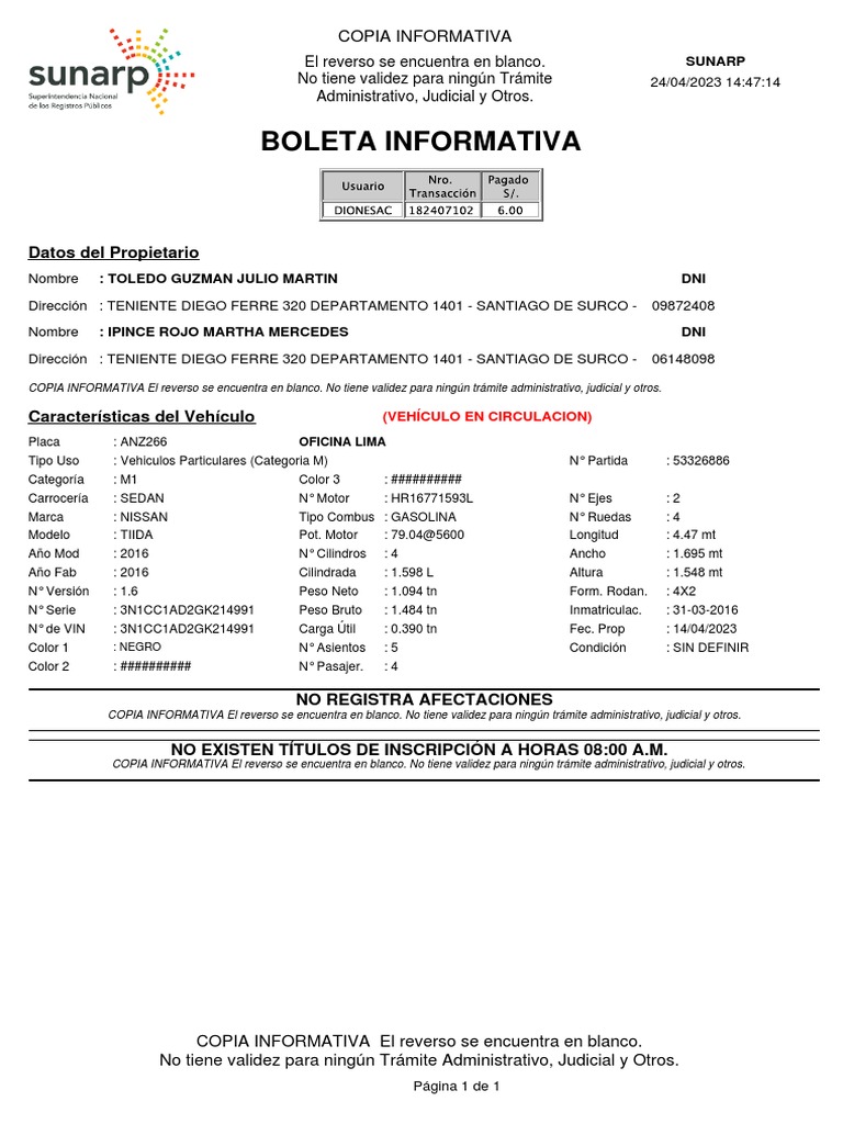 COPIA INFORMATIVA El reverso se encuentra en blanco. No tiene validez para ningún trámite administrativo, judicial y otros.