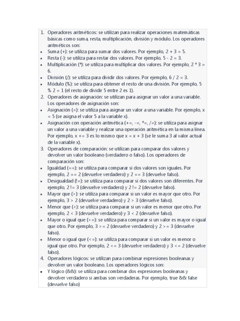 básicas como suma, resta, multiplicación, división y módulo. Los operadores