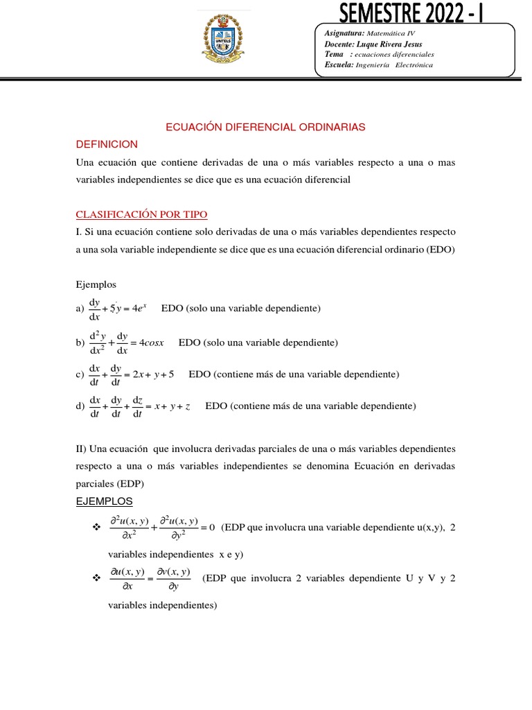 a una sola variable independiente se dice que es una ecuación diferencial ordinario (EDO)