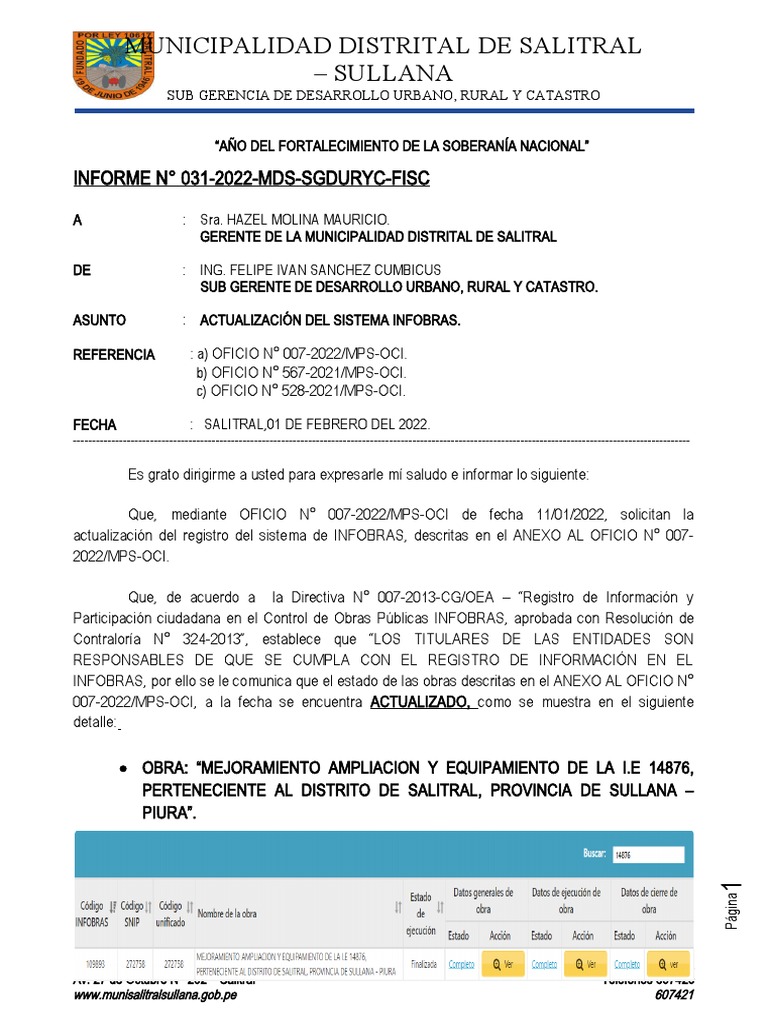 INFOBRAS, por ello se le comunica que el estado de las obras descritas en el ANEXO AL OFICIO N°