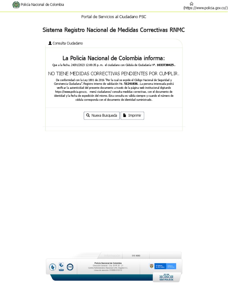 https://www.policia.gov.co, menú ciudadanos/ consulta medidas correctivas, con el documento de