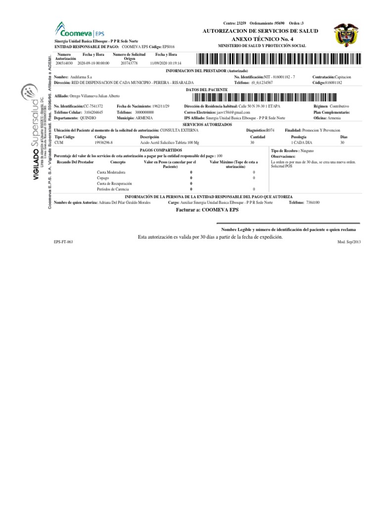 Nombre: Audifarma S.a No. Identificación:NIT - 816001182 - 7 Contratación:Capitacion