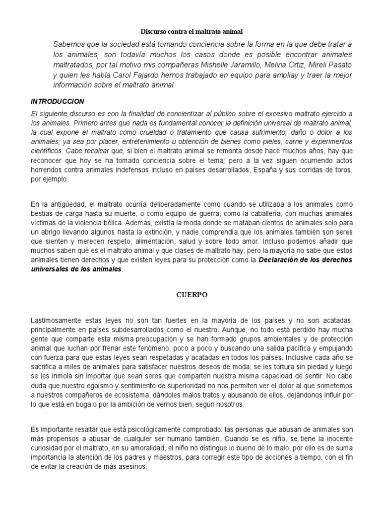 El siguiente discurso es con la finalidad de concientizar al público sobre el excesivo maltrato ejercido a