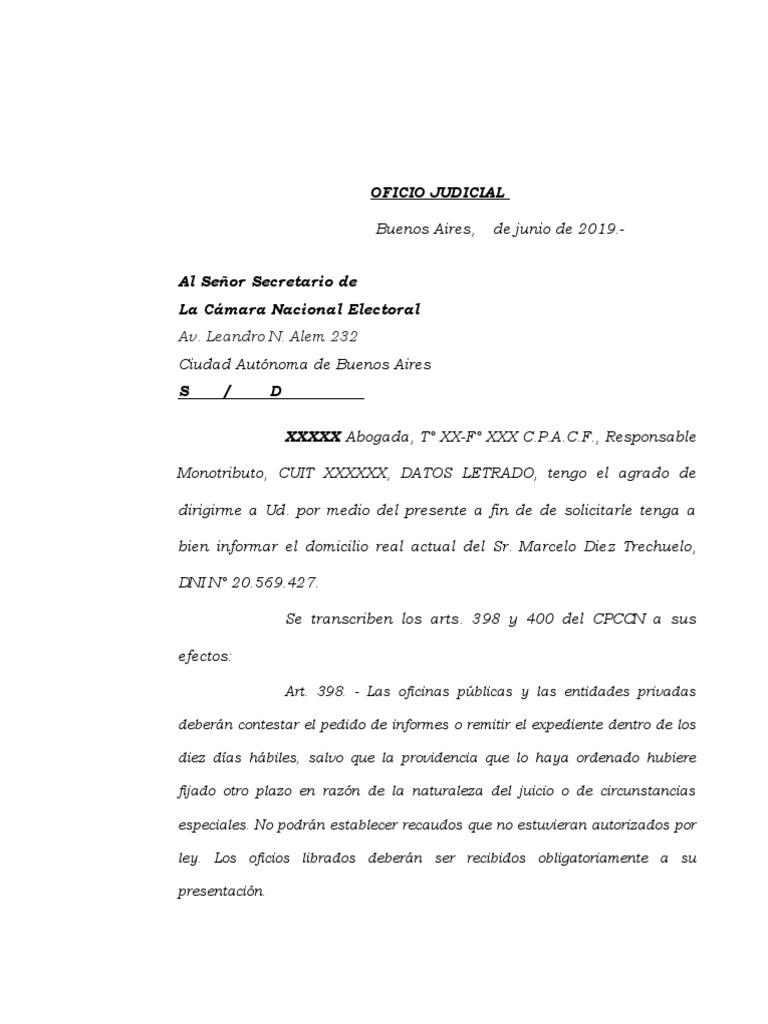 ley. Los oficios librados deberán ser recibidos obligatoriamente a su