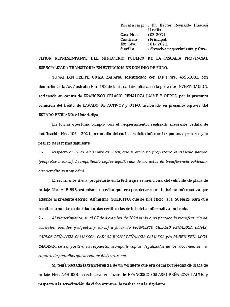 lavado de activos de San Romá n – Juliaca a cargo del Fiscal Dr. Gerardo Manuel Parí Vilca, en
