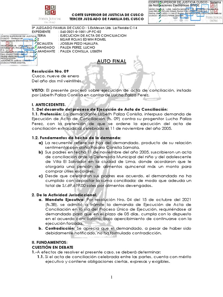 Ejecución de Acta de Conciliación (fs. 09) contra su progenitor Lucho Paliza