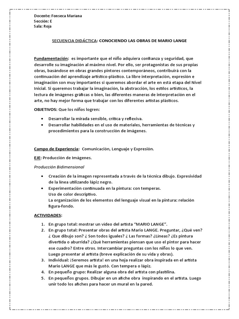 SECUENCIA DIDÁCTICA: CONOCIENDO LAS OBRAS DE MARIO LANGE