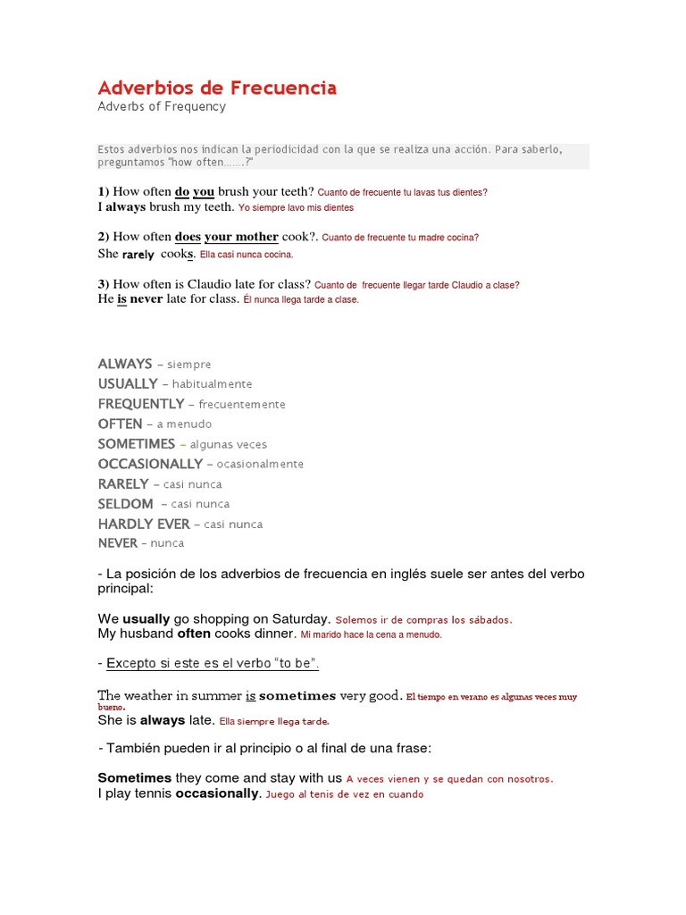 - La posición de los adverbios de frecuencia en inglés suele ser antes del verbo