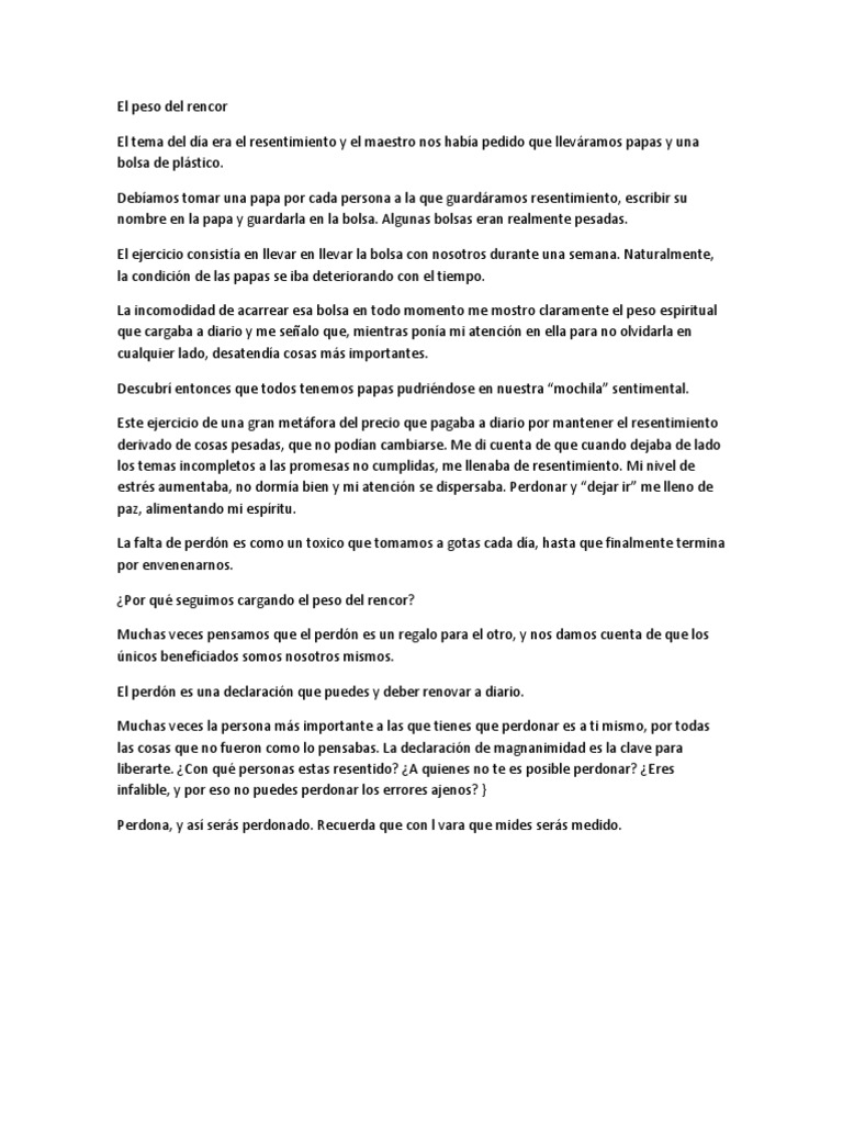 bolsa de plstico. Debamos tomar una papa por cada persona a la que guardramos resentimiento, escribir su nombre en la papa y guardarla en la bolsa. Algunas bolsas eran realmente pesadas. El ejercicio consista en llevar en llevar la bolsa con nosotros durante una semana. Naturalmente, la condicin de las papas se iba deteriorando con el tiempo. La incomodidad de acarrear esa bolsa en todo momento me mostro claramente el peso espiritual que cargaba a diario y me sealo que, mientras pona mi atencin en ella para no olvidarla en cualquier lado, desatenda cosas ms importantes. Descubr entonces que todos tenemos papas pudrindose en nuestra mochila sentimental. Este ejercicio de una gran metfora del precio que pagaba a diario por mantener el resentimiento derivado de cosas pesadas, que no podan cambiarse. Me di cuenta de que cuando dejaba de lado los temas incompletos a las promesas no cumplidas, me llenaba de resentimiento. Mi nivel de estrs aumentaba, no dorma bien y mi atencin se dispersaba. Perdonar y dejar ir me lleno de paz, alimentando mi espritu. La falta de perdn es como un toxico que tomamos a gotas cada da, hasta que finalmente termina por envenenarnos. Por qu seguimos cargando el peso del rencor? Muchas veces pensamos que el perdn es un regalo para el otro, y nos damos cuenta de que los nicos beneficiados somos nosotros mismos. El perdn es una declaracin que puedes y deber renovar a diario. Muchas veces la persona ms importante a las que tienes que perdonar es a ti mismo, por todas las cosas que no fueron como lo pensabas. La declaracin de magnanimidad es la clave para liberarte. Con qu personas estas resentido? A quienes no te es posible perdonar? Eres infalible, y por eso no puedes perdonar los errores ajenos? } Perdona, y as sers perdonado. Recuerda que con l vara que mides sers medido.
