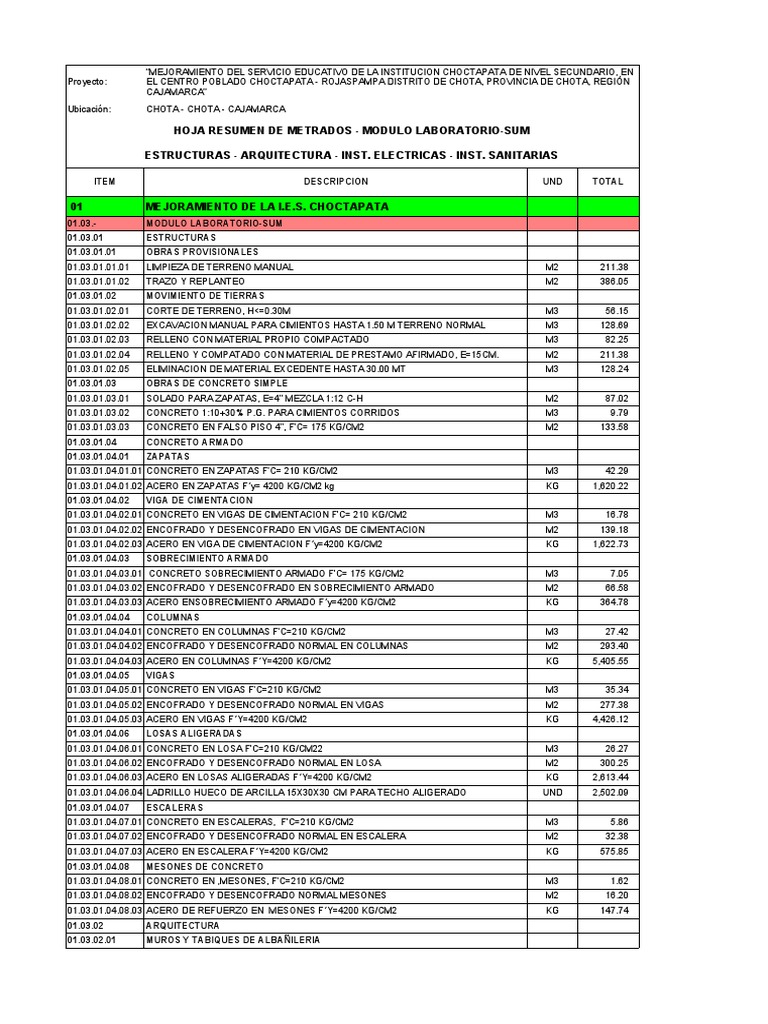 HOJA RESUMEN DE METRADOS - MODULO LABORATORIO-SUM