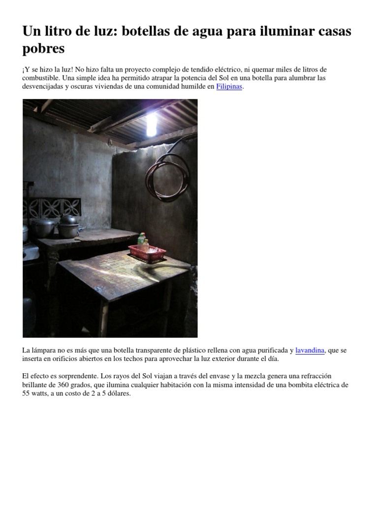 La lmpara no es ms que una botella transparente de plstico rellena con agua purificada y lavandina, que se inserta en orificios abiertos en los techos para aprovechar la luz exterior durante el da. El efecto es sorprendente. Los rayos del Sol viajan a travs del envase y la mezcla genera una refraccin brillante de 360 grados, que ilumina cualquier habitacin con la misma intensidad de una bombita elctrica de 55 watts, a un costo de 2 a 5 dlares.