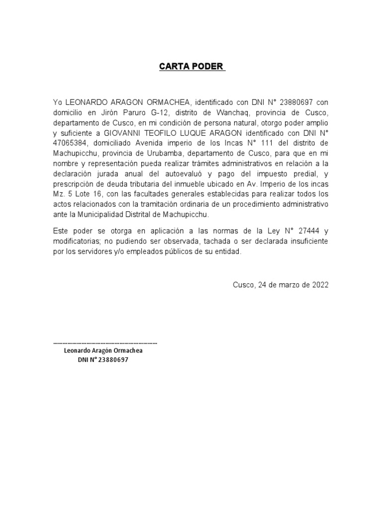departamento de Cusco, en mi condición de persona natural, otorgo poder amplio