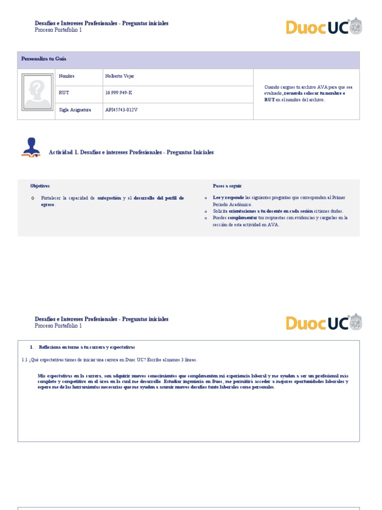 1.1 ¿Qué expectativas tienes de iniciar una carrera en Duoc UC? Escribe al menos 3 líneas.