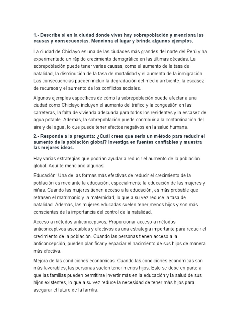 - Describe si en la ciudad donde vives hay sobrepoblación y menciona las