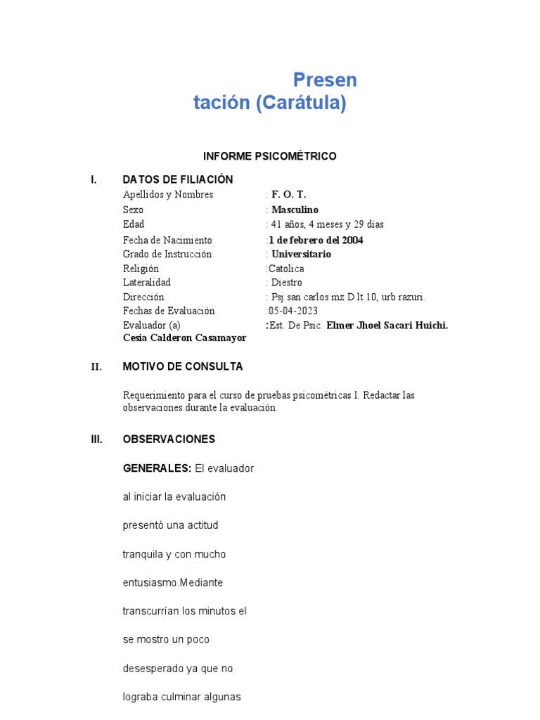 Evaluador (a) :Est. De Psic. Elmer Jhoel Sacari Huichi.