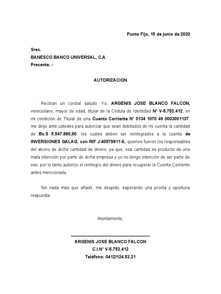 me dirijo ante ustedes para autorizar que sean debitados de mi cuenta la cantidad
