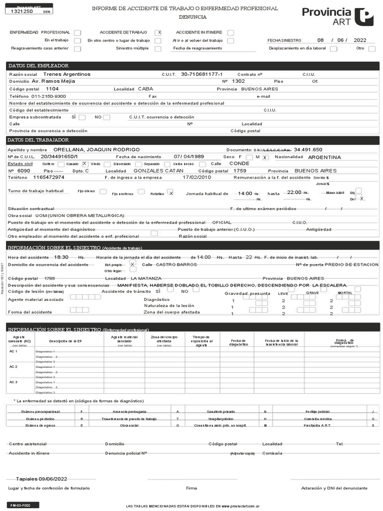 Teléfono 1165472974 F. de ingreso a la empresa 17/02/2010 Remuneración a la f. del accidente Sueldo $