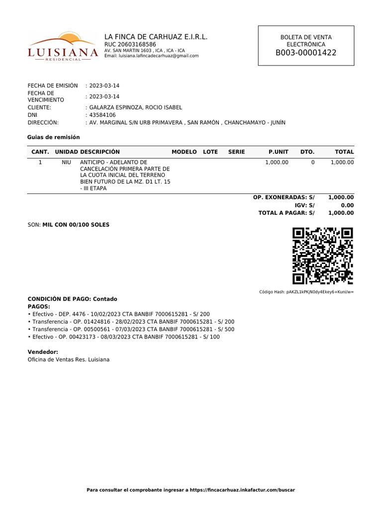 Para consultar el comprobante ingresar a https://fincacarhuaz.inkafactur.com/buscar