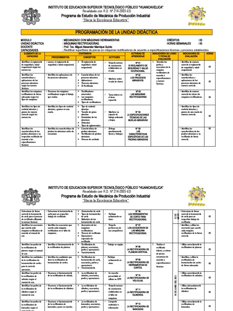 UNIDAD DIDÁCTICA : MÁQUINAS RECTIFICADORAS. HORAS SEMANALES : 05