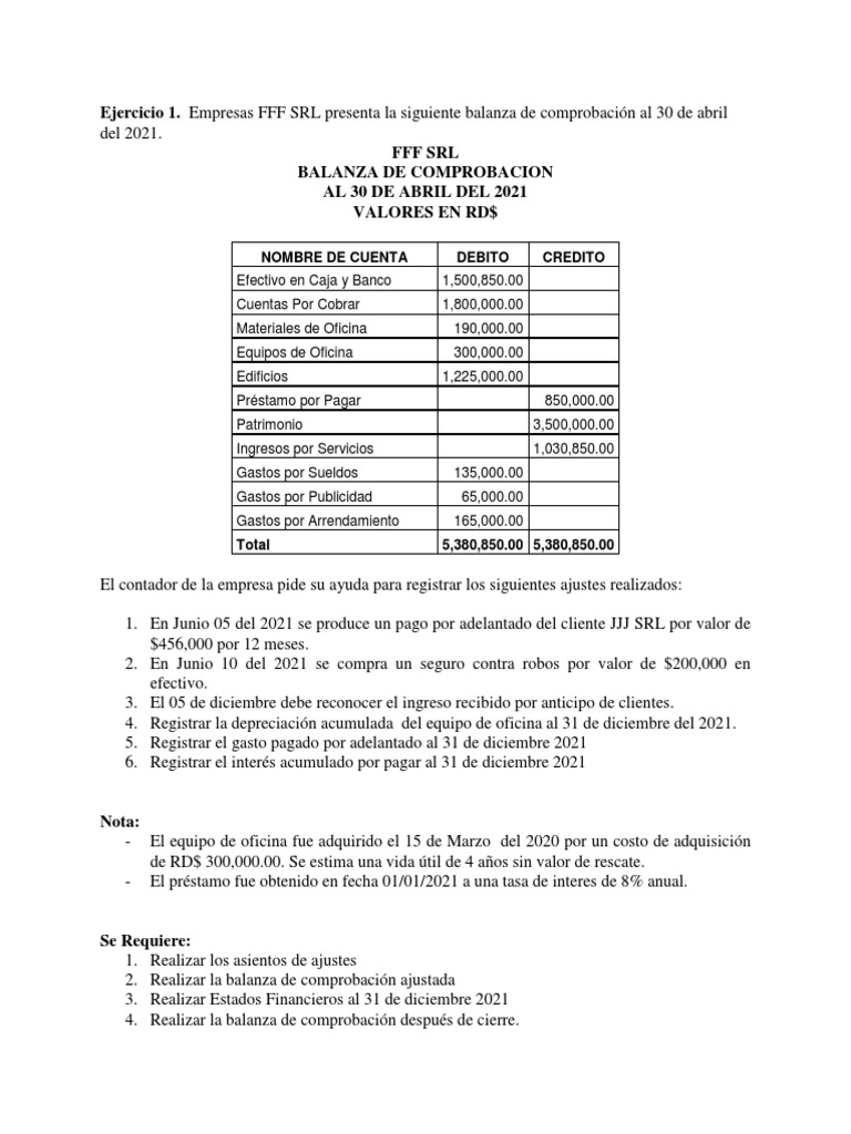 Empresas FFF SRL presenta la siguiente balanza de comprobación al 30 de abril