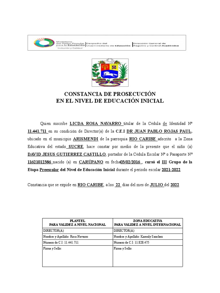 Educativa del estado Sucre, hace constar por medio de la presente que el niño(a), DAVID