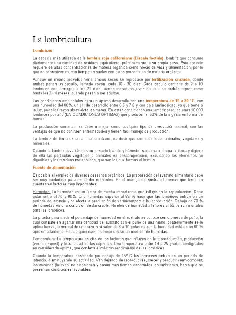 la luz, pues los rayos ultravioleta las matan. En estas condiciones una lombriz produce unas 10.000