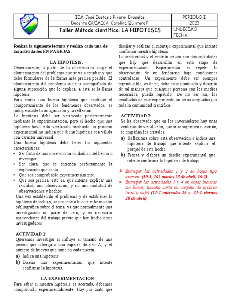 Taller Método científico. LA HIPOTESIS UNDECIMO