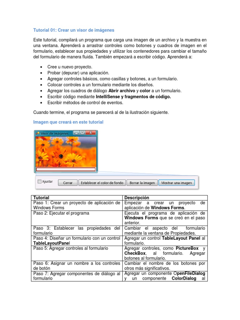 en una ventana. Aprender a arrastrar controles como botones y cuadros de imagen en el formulario, establecer sus propiedades y utilizar los contenedores para cambiar el tamao del formulario de manera fluida. Tambin empezar a escribir cdigo. Aprender a: Cree u nuevo proyecto. Probar (depurar) una aplicacin. Agregar controles bsicos, como casillas y botones, a un formulario. Colocar controles a un formulario mediante los diseos. Agregar los cuadros de dilogo Abrir archivo y color a un formulario. Escribir cdigo mediante IntelliSense y fragmentos de cdigo. Escribir mtodos de control de eventos.
