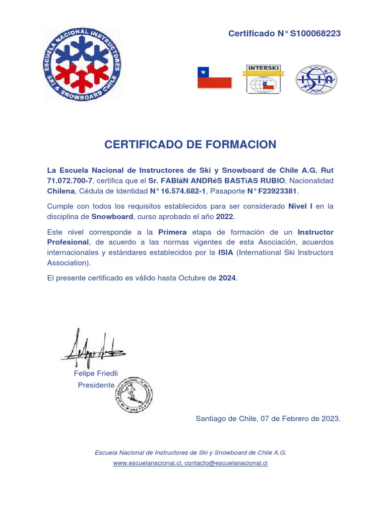 La Escuela Nacional de Instructores de Ski y Snowboard de Chile A.G. Rut