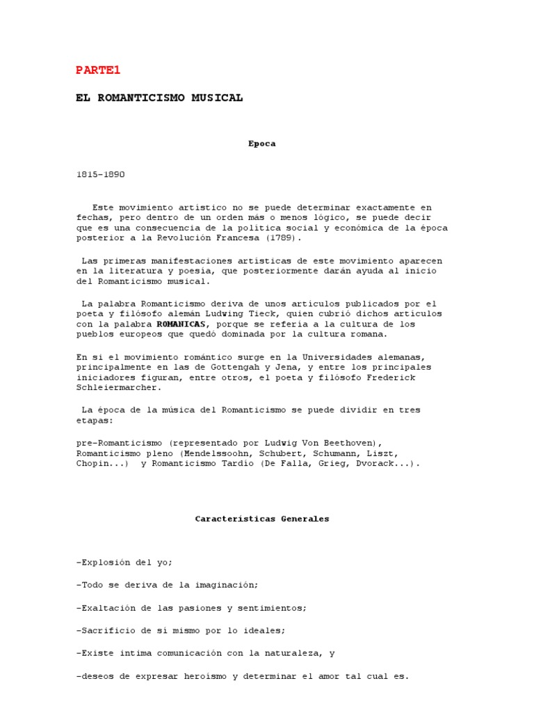 Este movimiento artstico no se puede determinar exactamente en fechas, pero dentro de un orden ms o menos lgico, se puede decir que es una consecuencia de la poltica social y econmica de la poca posterior a la Revolucin Francesa (1789). Las primeras manifestaciones artsticas de este movimiento aparecen en la literatura y poesa, que posteriormente darn ayuda al inicio del Romanticismo musical. La palabra Romanticismo deriva de unos artculos publicados por el poeta y filsofo alemn Ludwing Tieck, quien cubri dichos artculos con la palabra ROMANICAS, porque se refera a la cultura de los pueblos europeos que qued dominada por la cultura romana. En si el movimiento romntico surge en la Universidades alemanas, principalmente en las de Gottengah y Jena, y entre los principales iniciadores figuran, entre otros, el poeta y filsofo Frederick Schleiermarcher. La poca de la msica del Romanticismo se puede dividir en tres etapas: pre-Romanticismo (representado por Ludwig Von Beethoven), Romanticismo pleno (Mendelssoohn, Schubert, Schumann, Liszt, Chopin...) y Romanticismo Tardo (De Falla, Grieg, Dvorack...).