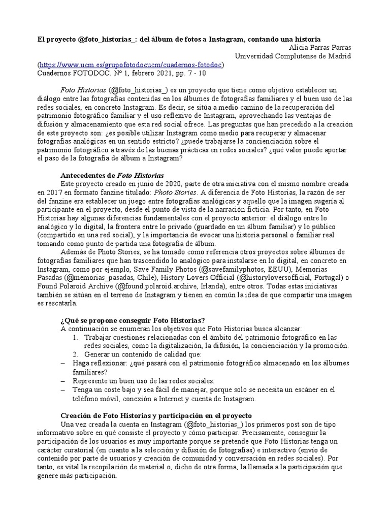 • Parras Parras, A. (2021): El proyecto @foto_historias_: del álbum de fotos a Instagram,