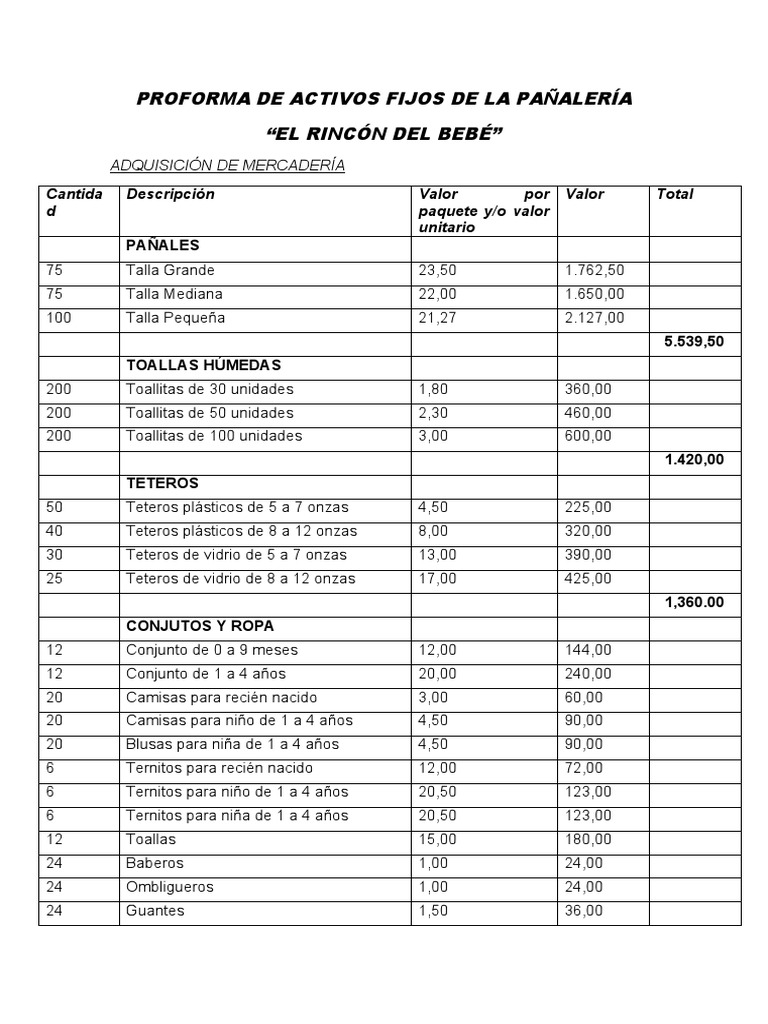 PROFORMA DE ACTIVOS FIJOS DE LA PAÑALERÍA