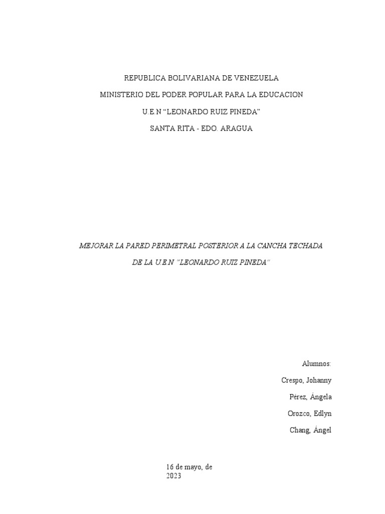 1. Mejorar la infraestructura de la pared de la U.E.N “Leonardo Ruiz Pineda”.