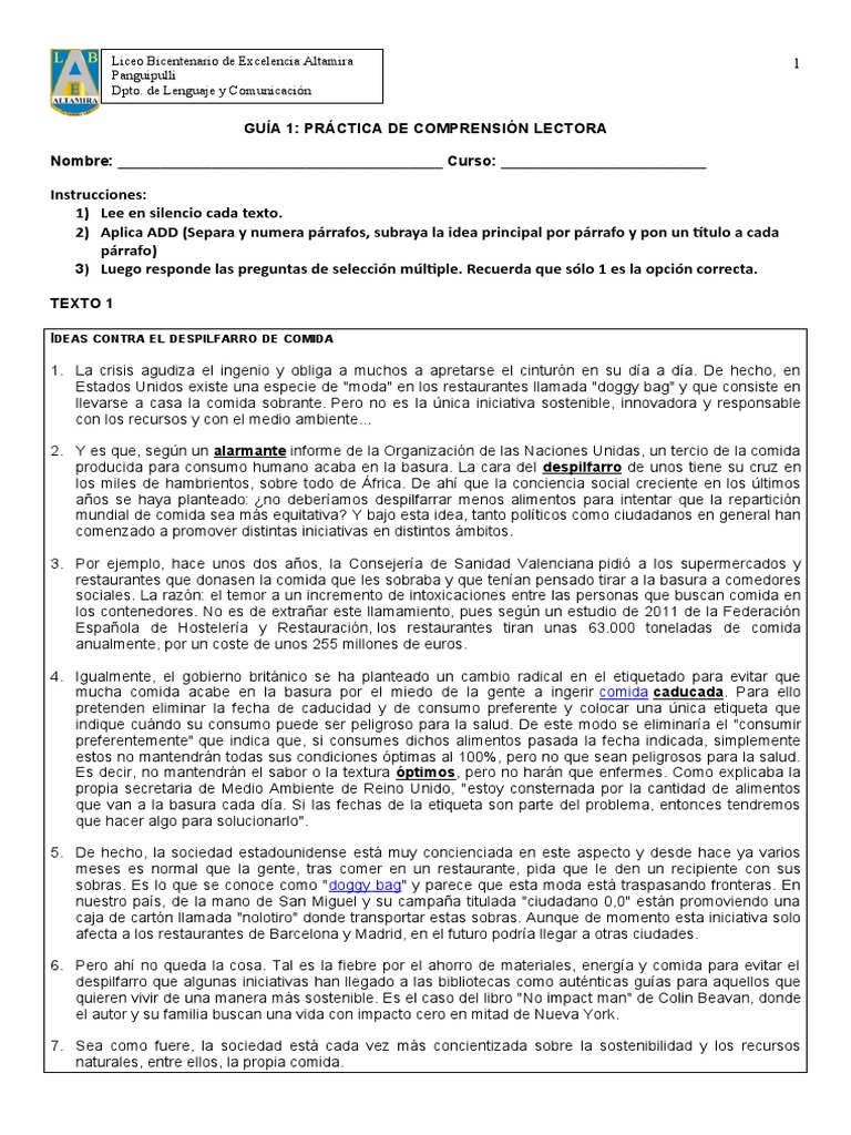 GUÍA 1: PRÁCTICA DE COMPRENSIÓN LECTORA
