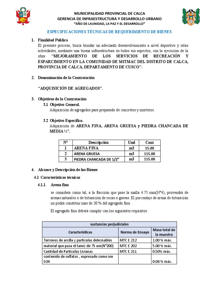 Adquisición de ARENA FINA, ARENA GRUESA y PIEDRA CHANCADA DE
