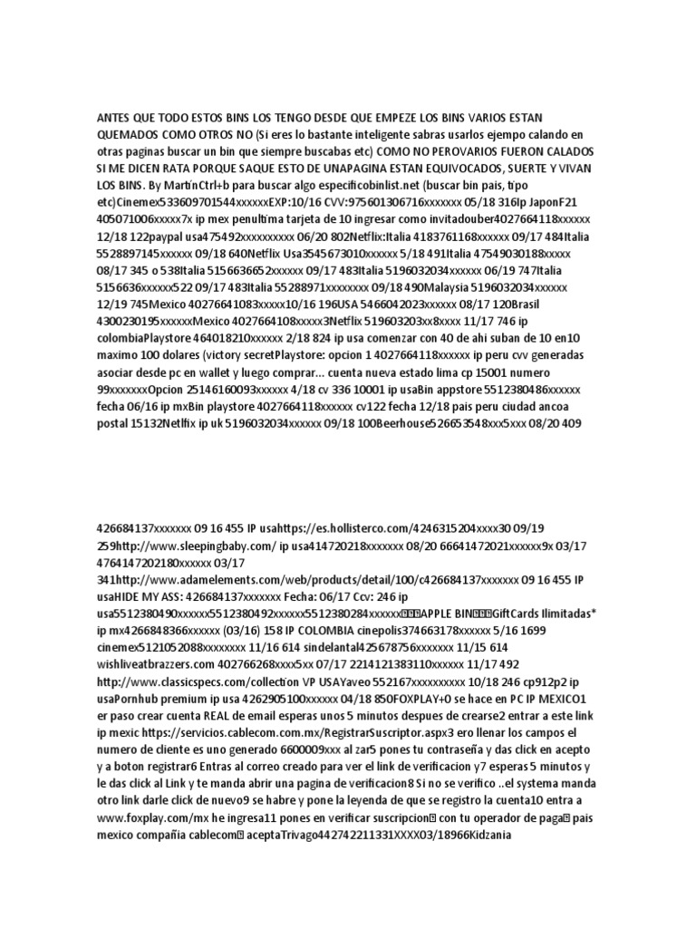 4300230195xxxxxxMexico 4027664108xxxxx3Netflix 519603203xx8xxxx 11/17 746 ip
