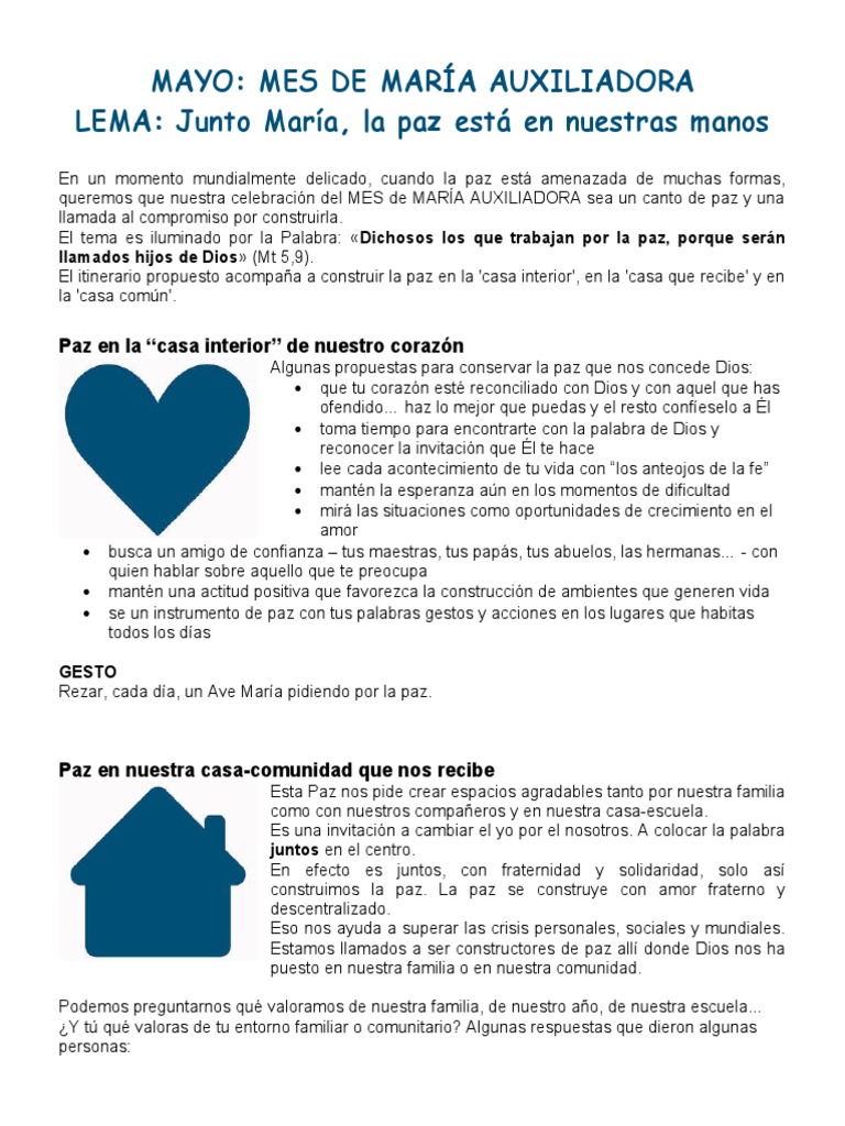 queremos que nuestra celebración del MES de MARÍA AUXILIADORA sea un canto de paz y una