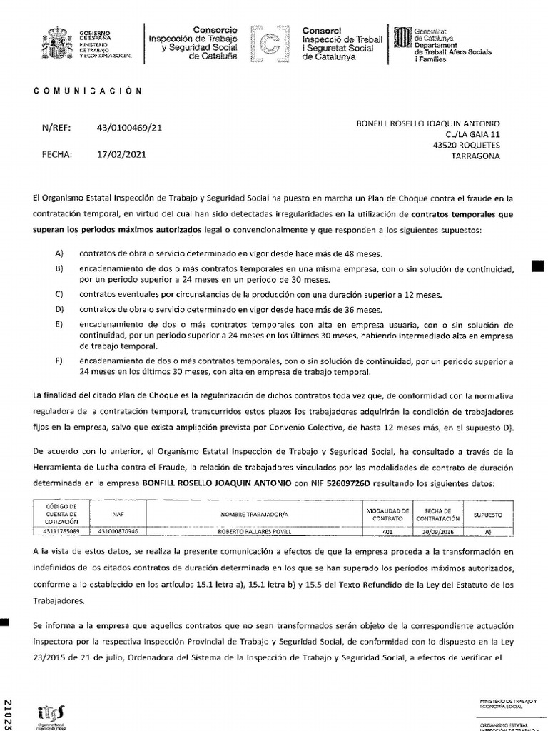 A la vista de estos datos, se realiza la presente comunicacion a efectos de que la empresa proceda a la transformacién en