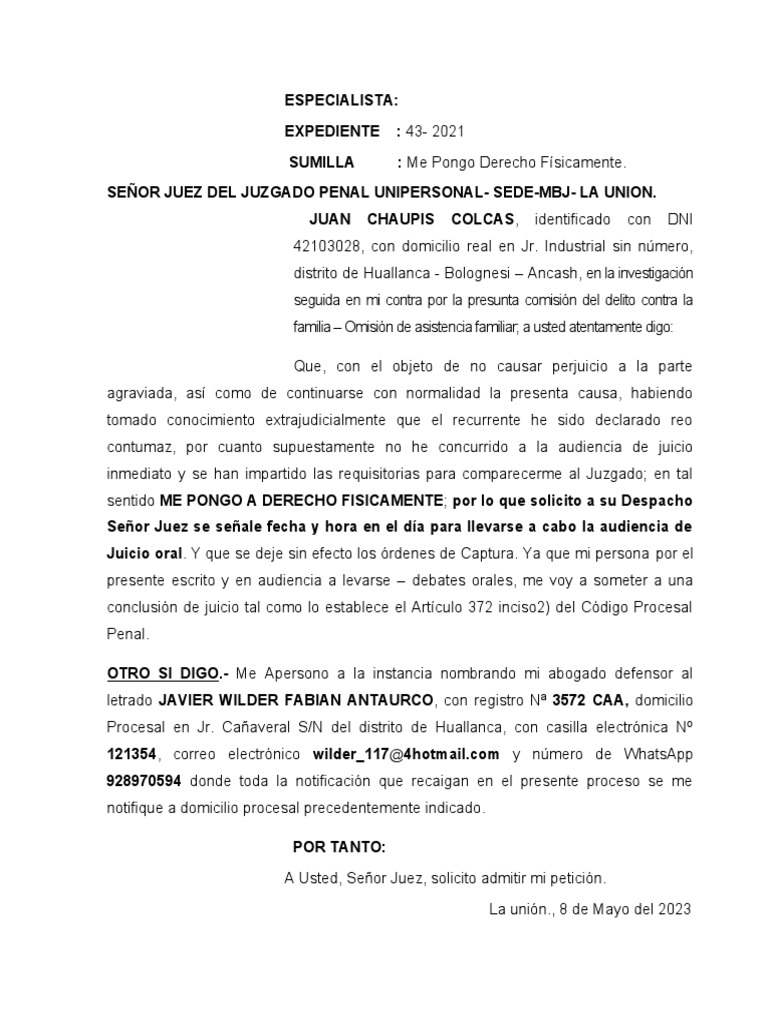 sentido ME PONGO A DERECHO FISICAMENTE; por lo que solicito a su Despacho