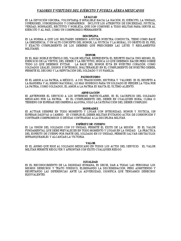 VALORES Y VIRTUDES DEL EJÉRCITO Y FUERZA AÉREA MEXICANOS