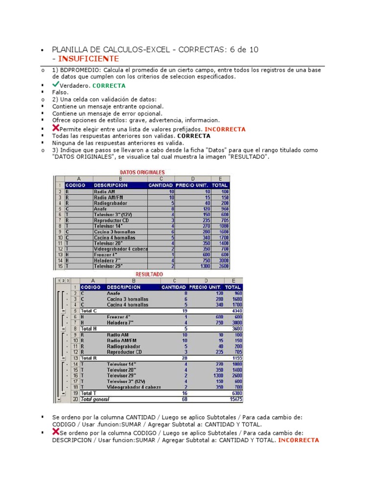 DESCRIPCION / Usar funcion:SUMAR / Agregar Subtotal a: CANTIDAD Y TOTAL. INCORRECTA