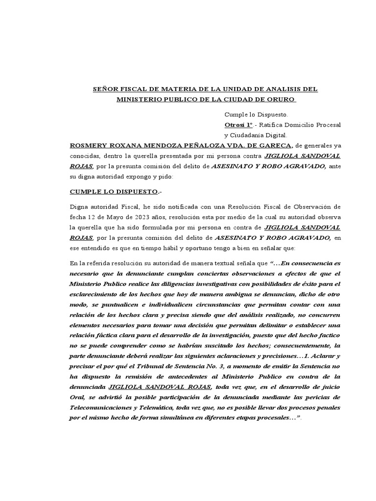 la querella que ha sido formulada por mi persona en contra de JIGLIOLA SANDOVAL