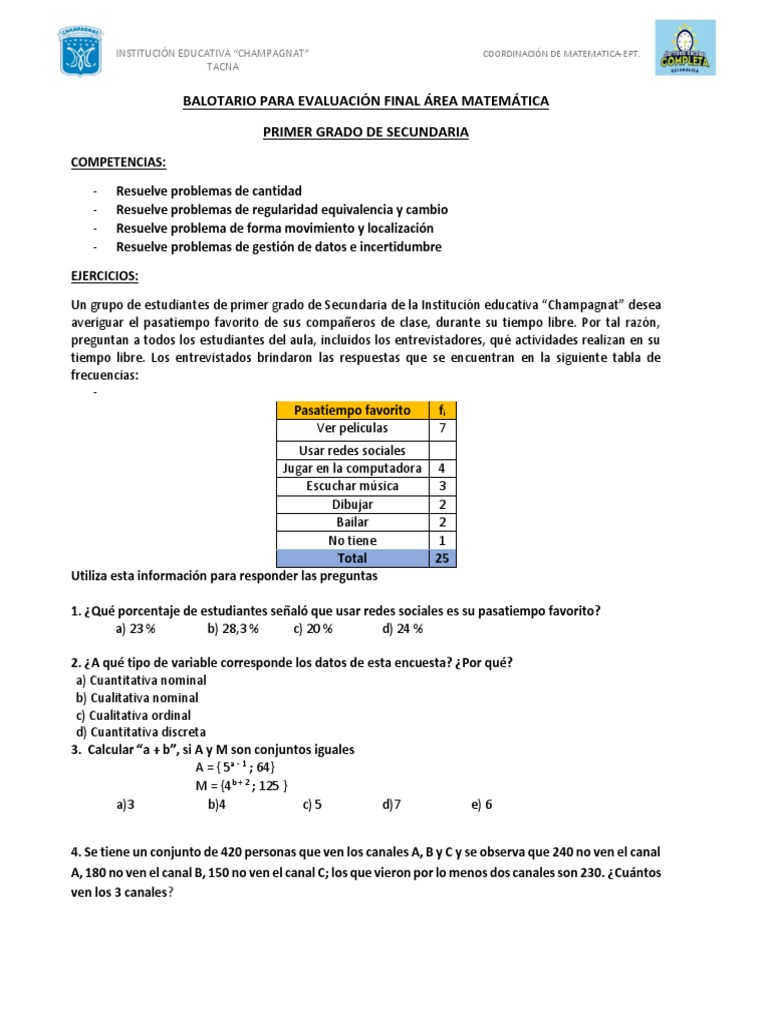 BALOTARIO PARA EVALUACIÓN FINAL ÁREA MATEMÁTICA