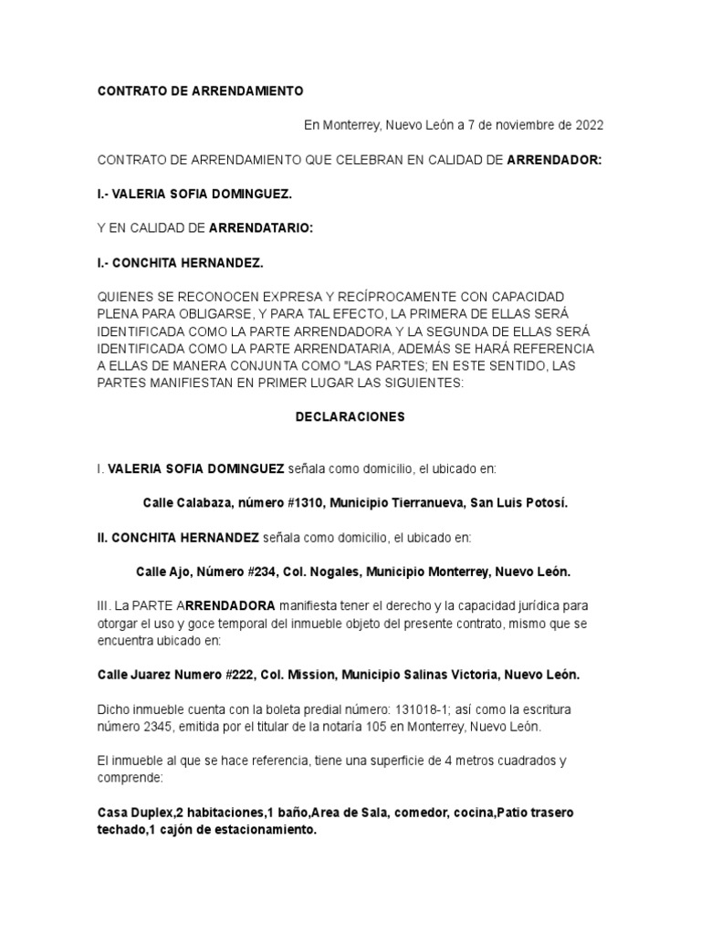 inmueble objeto del arrendamiento así como del lugar de estacionamiento que se incluye