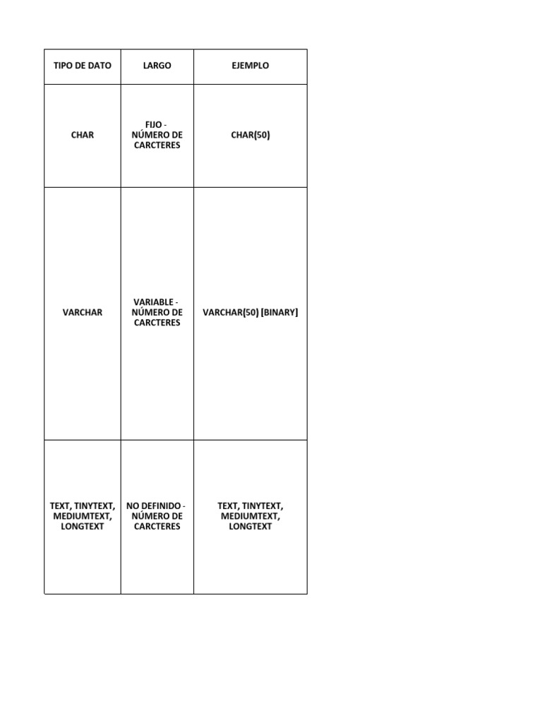 TEXT, TINYTEXT, NO DEFINIDO - TEXT, TINYTEXT,