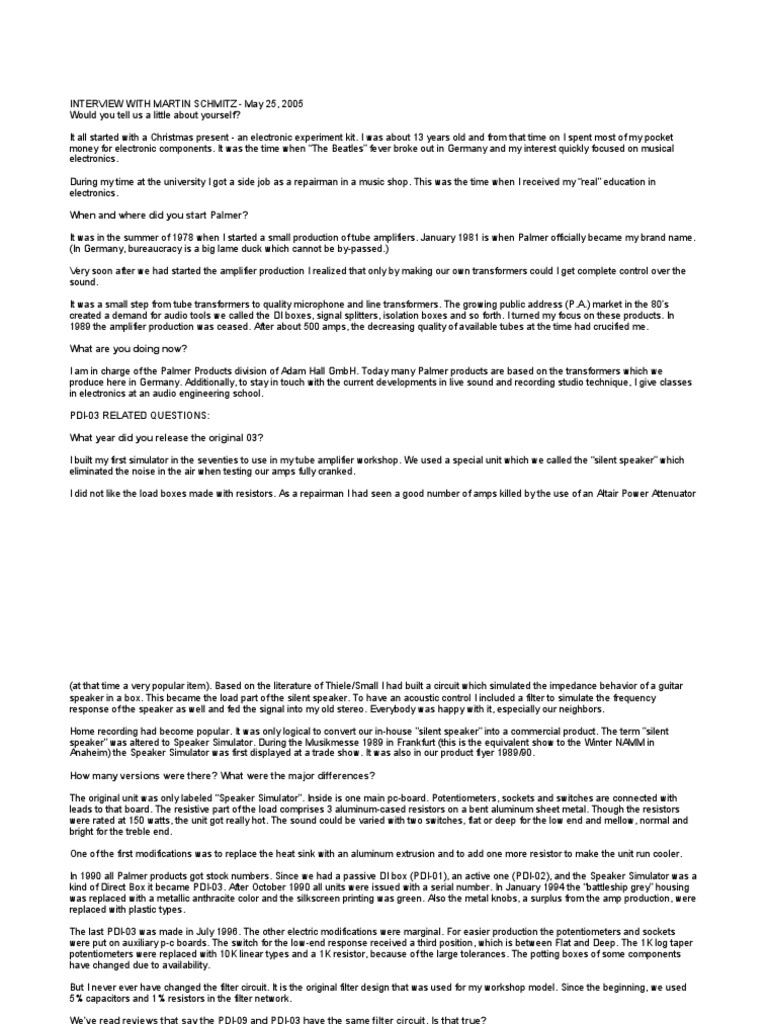 (at that time a very popular item). Based on the literature of Thiele/Small I had built a circuit which simulated the impedance behavior of a guitar speaker in a box. This became the load part of the silent speaker. To have an acoustic control I included a filter to simulate the frequency response of the speaker as well and fed the signal into my old stereo. Everybody was happy with it, especially our neighbors. Home recording had become popular. It was only logical to convert our in-house "silent speaker" into a commercial product. The term "silent speaker" was altered to Speaker Simulator. During the Musikmesse 1989 in Frankfurt (this is the equivalent show to the Winter NAMM in Anaheim) the Speaker Simulator was first displayed at a trade show. It was also in our product flyer 1989/90. How many versions were there? What were the major differences? The original unit was only labeled Speaker Simulator. Inside is one main pc-board. Potentiometers, sockets and switches are connected with leads to that board. The resistive part of the load comprises 3 aluminum-cased resistors on a bent aluminum sheet metal. Though the resistors were rated at 150 watts, the unit got really hot. The sound could be varied with two switches, flat or deep for the low end and mellow, normal and bright for the treble end. One of the first modifications was to replace the heat sink with an aluminum extrusion and to add one more resistor to make the unit run cooler. In 1990 all Palmer products got stock numbers. Since we had a passive DI box (PDI-01), an active one (PDI-02), and the Speaker Simulator was a kind of Direct Box it became PDI-03. After October 1990 all units were issued with a serial number. In January 1994 the battleship grey housing was replaced with a metallic anthracite color and the silkscreen printing was green. Also the metal knobs, a surplus from the amp production, were replaced with plastic types. The last PDI-03 was made in July 1996. The other electric modifications were marginal. For easier production the potentiometers and sockets were put on auxiliary p-c boards. The switch for the low-end response received a third position, which is between Flat and Deep. The 1K log taper potentiometers were replaced with 10K linear types and a 1K resistor, because of the large tolerances. The potting boxes of some components have changed due to availability. But I never ever have changed the filter circuit. It is the original filter design that was used for my workshop model. Since the beginning, we used 5% capacitors and 1% resistors in the filter network. We've read reviews that say the PDI-09 and PDI-03 have the same filter circuit. Is that true? Yes. The PDI-09 uses the same highcut-filter circuit as the PDI-03. The PDI-09 is nothing else than a PDI-03 without the load part and the signal splitter feature. The PDI-03 has an extra (switchable) bass boost. Oh! In the mid 90s the Normal position was made a bit softer, but this is the only sound modification the PDI-09 has ever gotten.