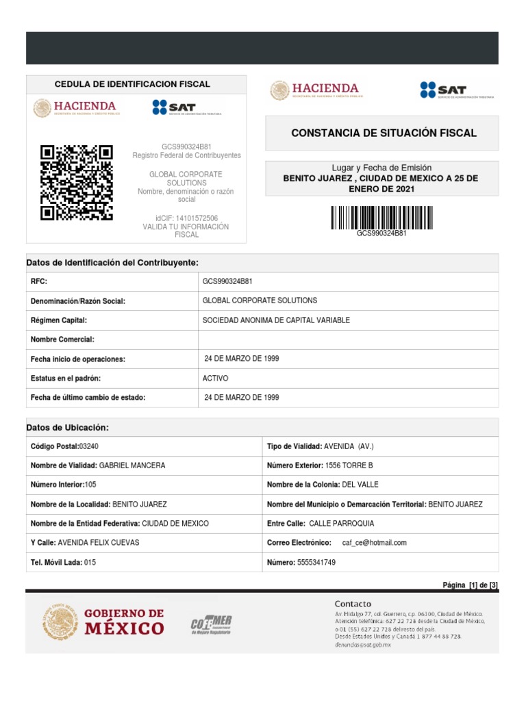 Cadena Original Sello: ||2021/01/25|GCS990324B81|CONSTANCIA DE SITUACIÓN FISCAL|200001088888800000031||