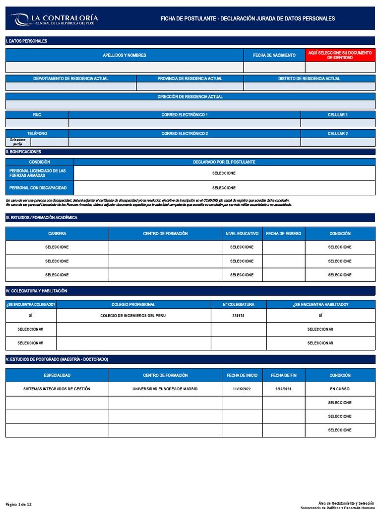 La información contenida en la Ficha de Postulante tiene carácter de Declaración Jurada, para lo cual la Contraloría General de la República tomará en cuenta la información en ella consignada, reservándose el derecho de llevar a